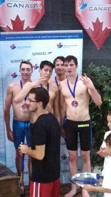 Also on Thursday night, the relay team consisting of Nicholas Sinclair (1:53.75), Craig Dagnall (1:55.42), Evan Letkeman (1:56.02), and Ryan Howe (1:55.36) took home the BRONZE MEDAL in the 4x200m Freestyle in a time of 7:40.55!!! Congratulations guys, and good luck in your remaining events!