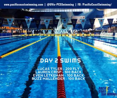 Day two was highlighted by two big swims from sixteen-year old Lauren Crisp in the 100 back. Crisp opened the day up by recording a best time of 1:03.09 in prelims, and earning the last berth (20th place) into the B Final of the event. She backed that up at night under the lights, with an impressive back half of the race, to post her second personal best of the day in the event. Racing against international swimmers* from Latvia, New Zealand and the United States in the final, Crisp’s posted a blazing time of 1:02.74, placing her 2nd in her swim and 12th overall in the event. Her finals time set a new UVPCS 15-17 year old 100 back record, a UVPCS Open Category 100 back record, as well as a Vancouver Island Regional 15-17 year old 100 back record.
