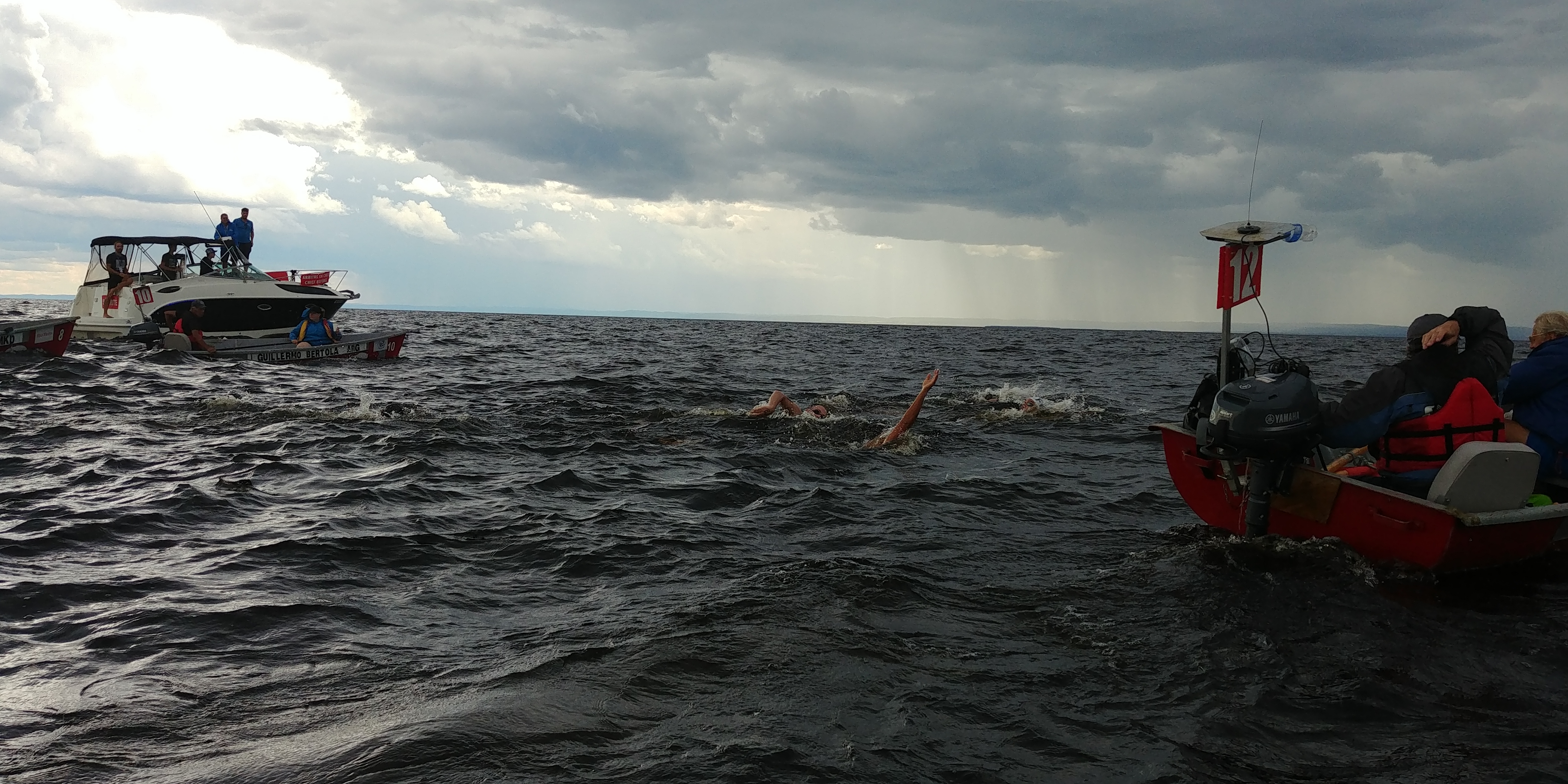 It was the 64th Annual Traversee de Lac St. Jean on Saturday, and Chris Deegan was representing PCS and his home country Australia in his first ultra-length Open Water Swim. The 32km swim takes place in a lake crossing, one long swim starting in a river in the north of the large lake, and finishing in the south at the town of Roberval. After getting on the bus out there at 5:45AM, getting the suit on and putting on a thick mixture of suntan lotion, vaseline, and zinc oxide, the swimmers started their race at 8:30AM. I jumped in a boat with a nice driver, had a lot of gatorade, bananas, and a small white board to communicate with Chris, and went off to coach him for the next 7 hours.