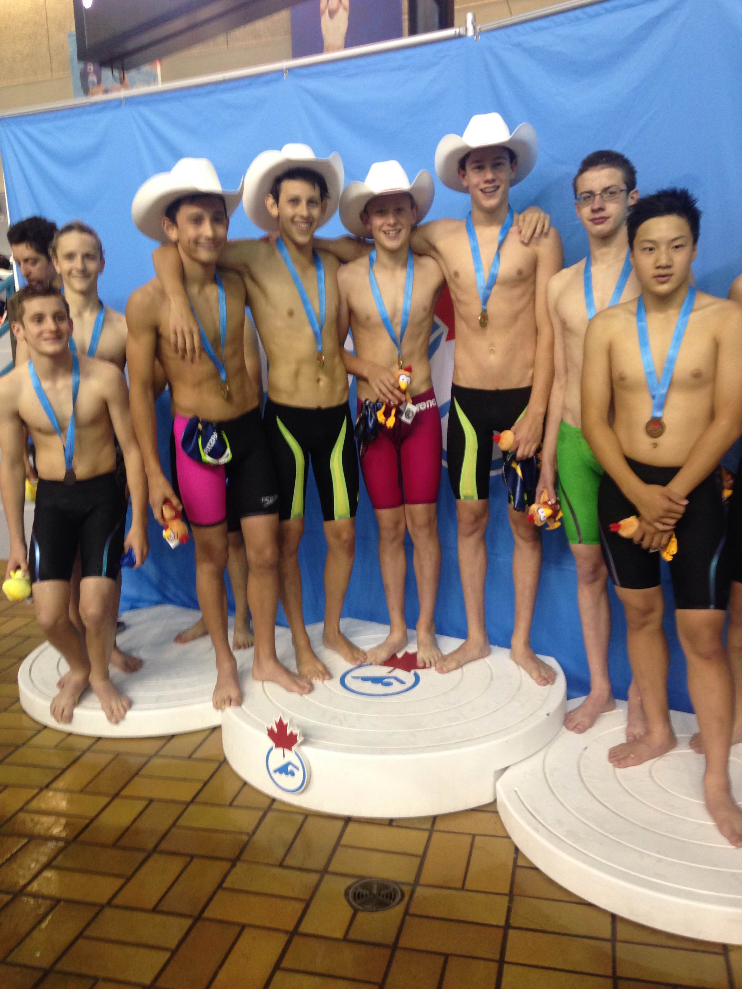 The end of finals brought the 4x100 Medley relays. The boys kicked off their last relay of the season with a great performance. Brendan Fitzpatrick started off with the backstroke, giving his team a very good start in second place position, up next was Michael Schmidt in his best stroke, the breastroke, and with a quick stroke rate and some powerful kick, he brings his team closer to the leading team and touches the wall to start off Keir Ogilvie. Doing butterfly, Ogilvie bypasses the first place team in the first 10 meters, giving Anthony Gutierrez an awesome lead of over 5 seconds. He keeps the lead and gains another two seconds or so, helping his team win yet another gold medal, to be presented to them on the top of the podium with matching cowboy hats.
