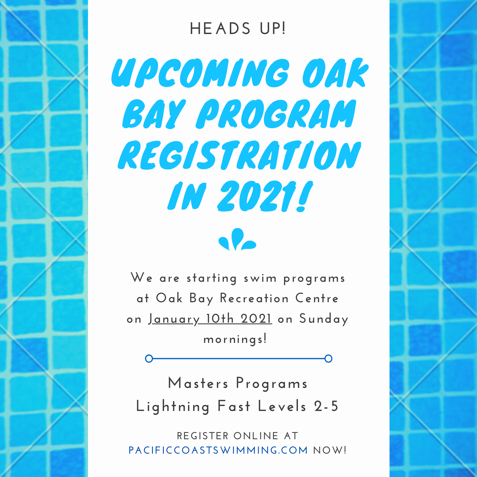 Big news! Oak Bay Recreation Centre will be offering programs on Sunday mornings in January 2021, including Masters and Lightning Fast Levels 2-5! These programs meet once per week and should continue through to June 2021. Registration is now open on the website! Looking forward to seeing you on the pool deck soon!
