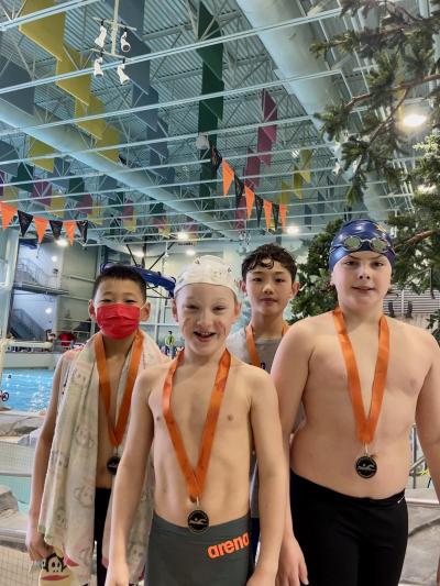 In the morning, our 12&unders had some fantastic racing and finishes. We started off stong with our 4x50m medley relay. Our 10& under girl's (Elodie Chernenkoff, Zoe Leong, Ada Chen, and Sophia Saska) relay tea placed 1st with an almost 10 second lead. Our 12& under relay tam (Karen Pan, Iris Wu, Mila Chernenkoff & Elizabeth Saska) placed 2nd narrowly two seconds behind the winning team. On the boy's side, our 10& under relay team placed 1st with a 10 second lead, and our 12& under team placed 2nd.