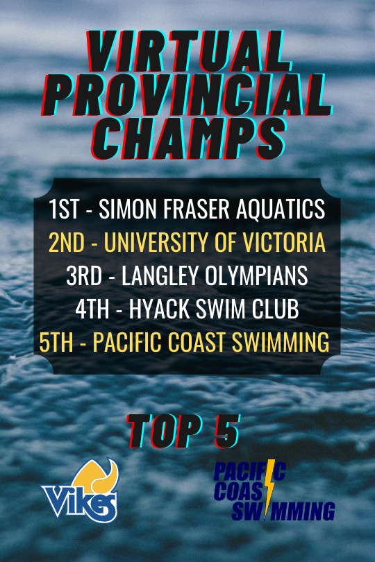 The Swim BC Virtual Provincial Championships have successfully completed with 525 swimmers participating from 38 clubs. The results are in and we are leading two of the top 5 teams in this year's Virtual Provincial Championships! Shout out and congratulations to all of our Vikes, Bolts and coaches who have been working so hard to push through this crazy season and pull off some amazing swims!