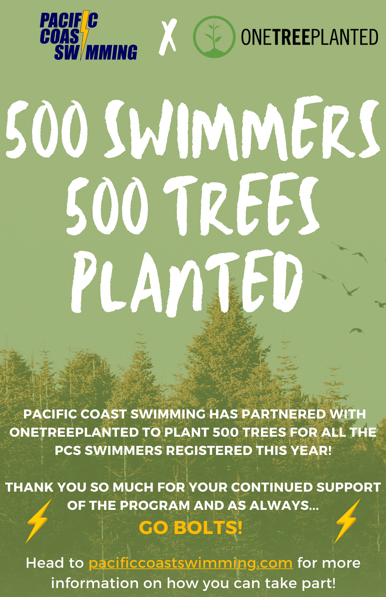 Despite a challenging season, we have hit an incredible milestone of registering our 500th swimmer this year! To celebrate this achievement, PCS has partnered with OneTreePlanted to plant 500 trees for all the PCS swimmers registered this year. OneTreePlanted is a registered non-profit environmental charity dedicated to making it easier for individuals and businesses to give back to the environment, create a healthier climate, protect biodiversity and help reforestation efforts around the world by planting 1 tree for every dollar donated. Check out their website to learn more!