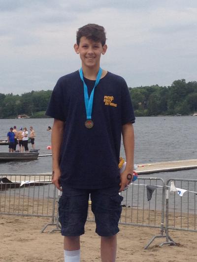 It was a stormy, cold morning at Lac-Beauport just outside of Quebec City but that didn't stop two PCS swimmers from making a trip to the podium. Anthony Gutierrez collected his first AGN gold medal, winning the 12&U boys 2.5km race, despite cutting up his leg on a rock at the start. Next, in the 17-18 year old boys 5km race, Justin Howe came out 5th in an exciting last 100 meter finish. The lone female swimmer, Erin Jennings did not disappoint in the 14 year old 5km race. After losing her cap in the first of four laps, Erin battled her way through strong wind and tough competition to land her 3rd on the podium.