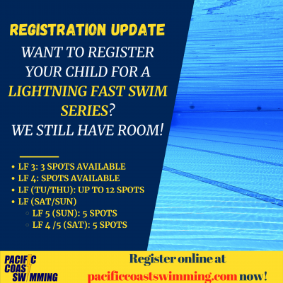 Interested in signing your child up for a Lightning Fast Swim Series? We still have room for you! We have 3-5 spots in most LF Levels 3-5 and up to 12 available in our Tu/Thu timeslot! Register online HERE!