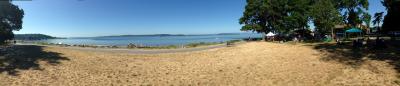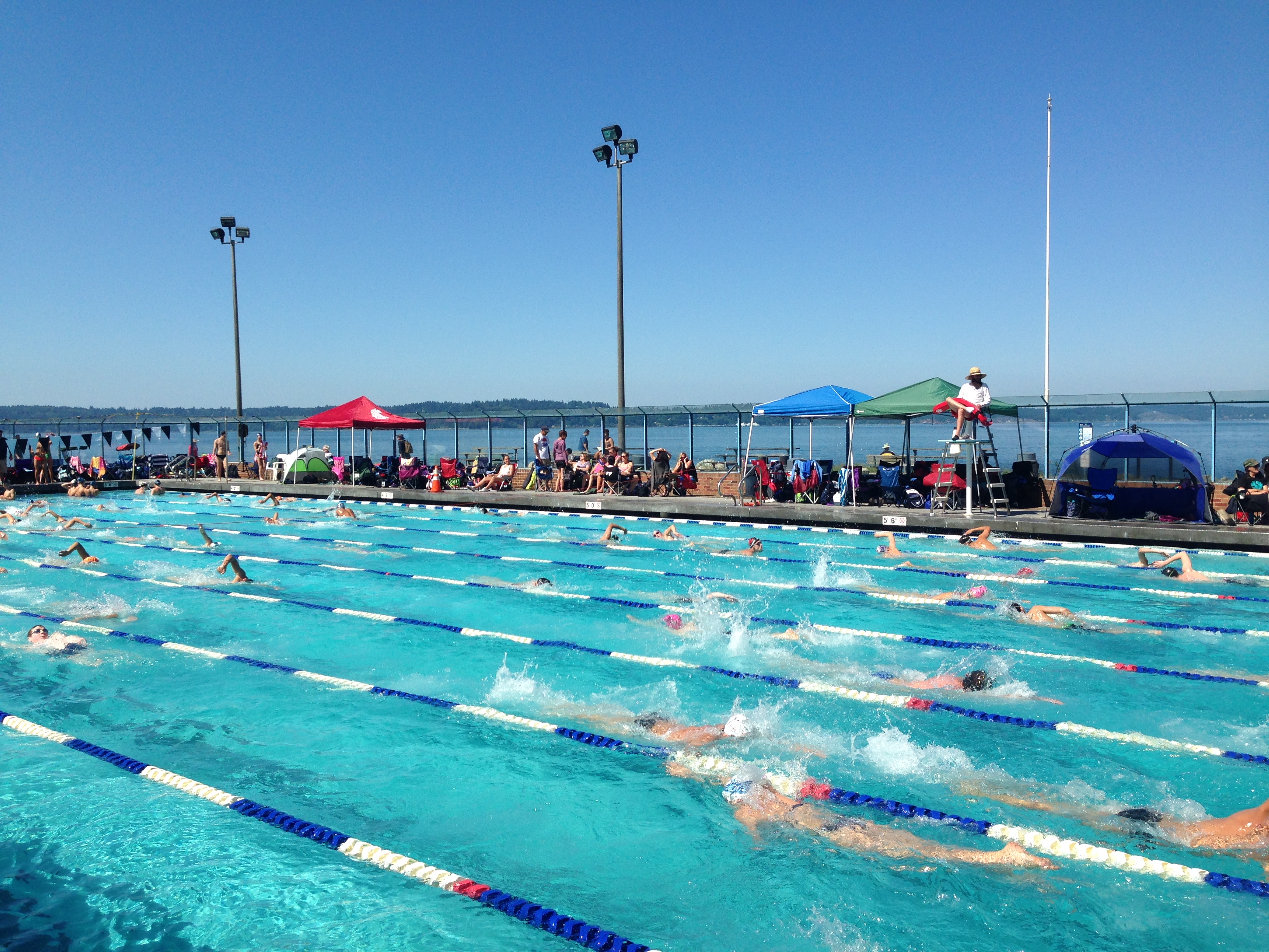 Jon McKay and coach Ryan left for a competition in Seattle as many PCS swimmers headed on a mission to Kamloops for AAA's. Jon was looking to get in some more competition before the upcoming National Championships in August, and is using this weekend as that preparation. The meet is at the beautiful Colman Pool, located in Lincoln Park in South Seattle. The pool is a 10 minute walk from the park's parking lot, and is located mere feet from the scenic beach. An outdoor meet is rare for Canadian swimmers, and venues don't get much more beautiful than this one.